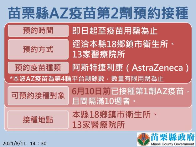 苗栗縣政府全球資訊網 中文網 呼籲6月10日前已接種az疫苗鄉親即日受理az第二劑疫苗預約